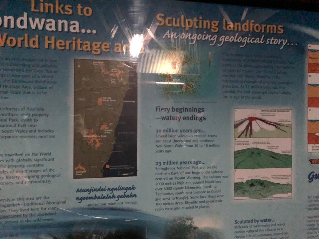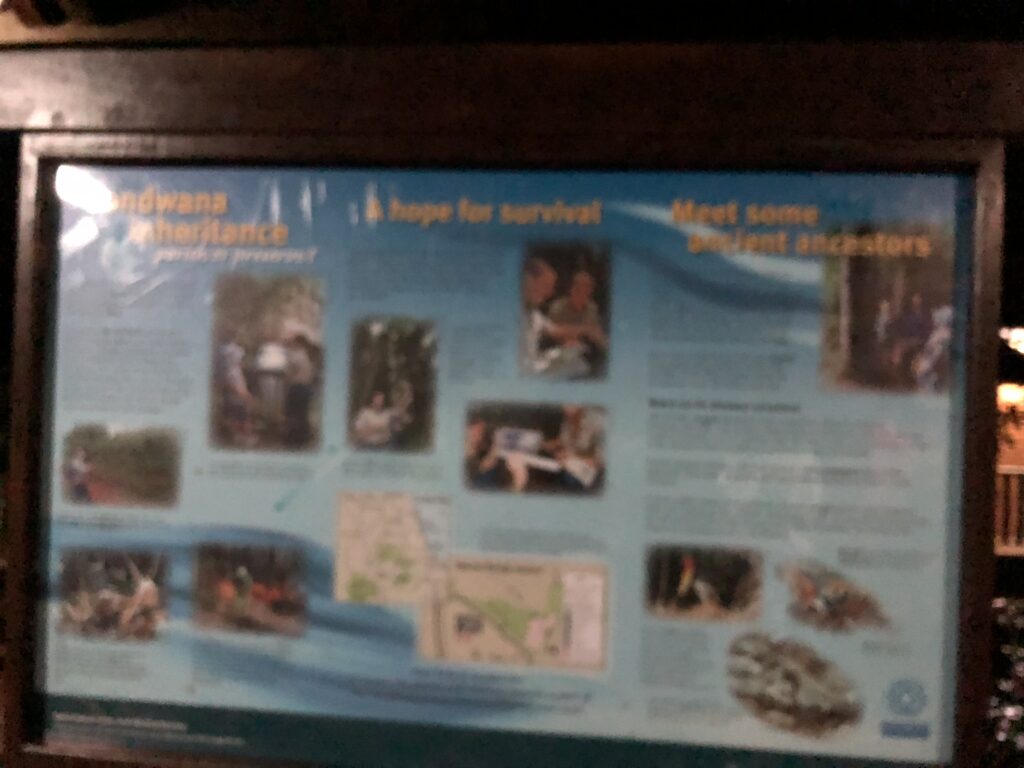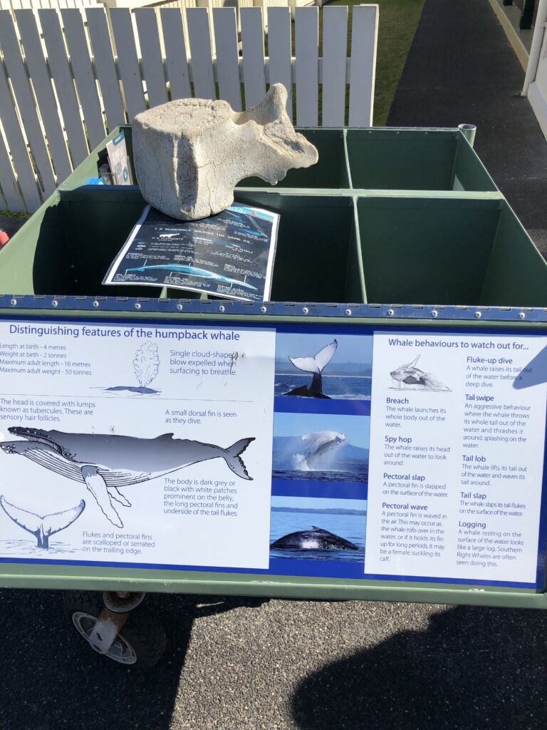 クイーンズランド州やニューサウスウェールズ州の海岸は、クジラの回遊ルートに近く、ザトウクジラ(Humpback Whale)の骨格の一部(おそらく椎骨か頭蓋骨の一部)と、クジラに関する詳細な情報パネルです。
