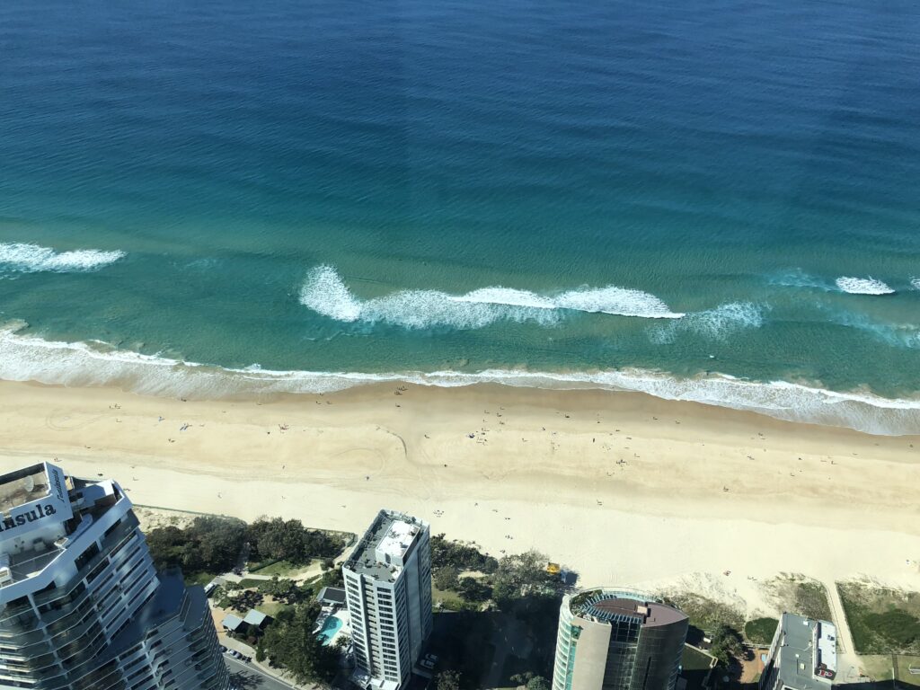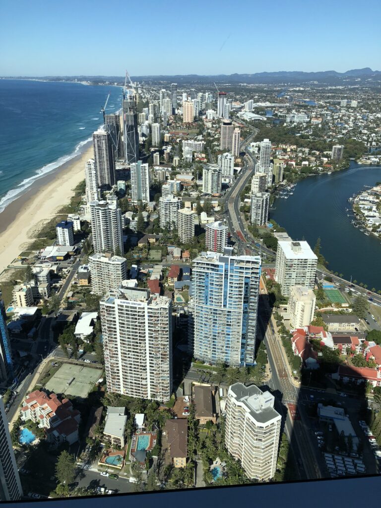 写真は、高いビルから海岸線と街並みを捉えた写真で、左側には美しいビーチと太平洋、そして右側には運河(ナーラン川)が流れている様子が確認できます。サーファーズ・パラダイスは、その高層ビルのスカイラインとビーチで知られる、ゴールドコーストを代表する観光地です。