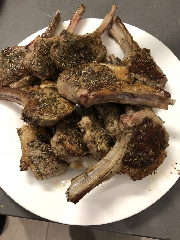 メインは、ハーブ(ローズマリーやタイム)とスパイスがたっぷりまぶされ、こんがり焼かれたメインのラムチョップ(仔羊の骨付き肉)