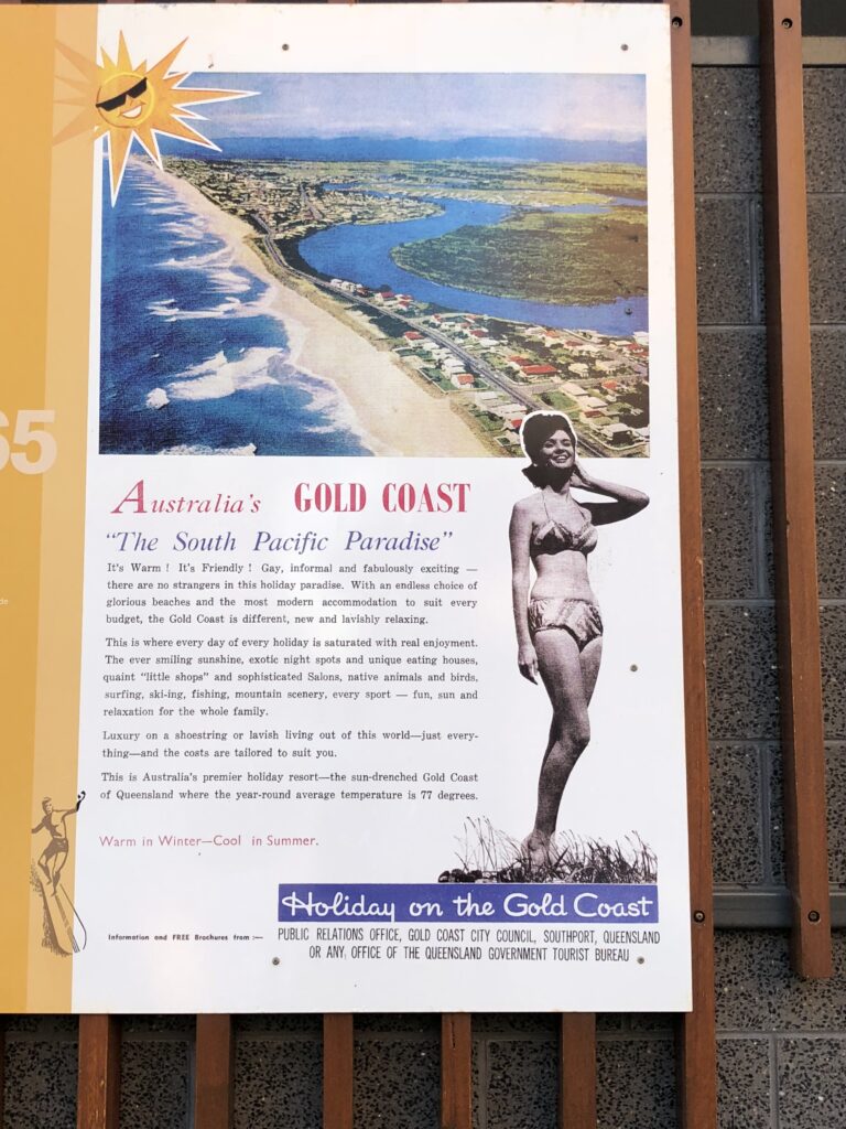 これは、1960年代から1970年代頃のレトロな雰囲気を持つ、オーストラリアのクイーンズランド州ゴールドコーストへの旅行を宣伝する看板の写真です。