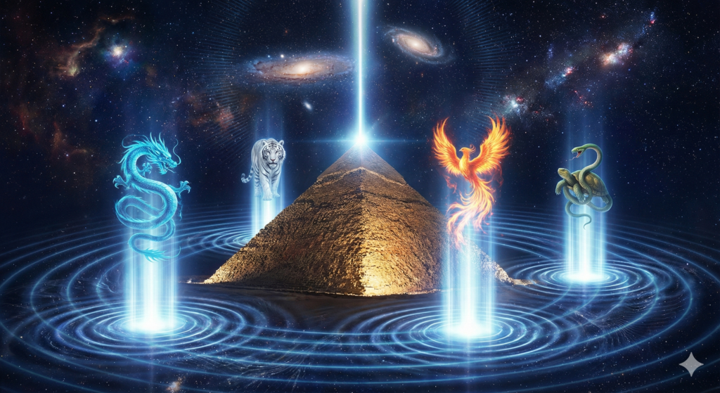 この画像は、壮大な宇宙空間に鎮座する黄金のピラミッドと、東西南北を護る伝説の四神(青龍・白虎・朱雀・玄武)を描いています。