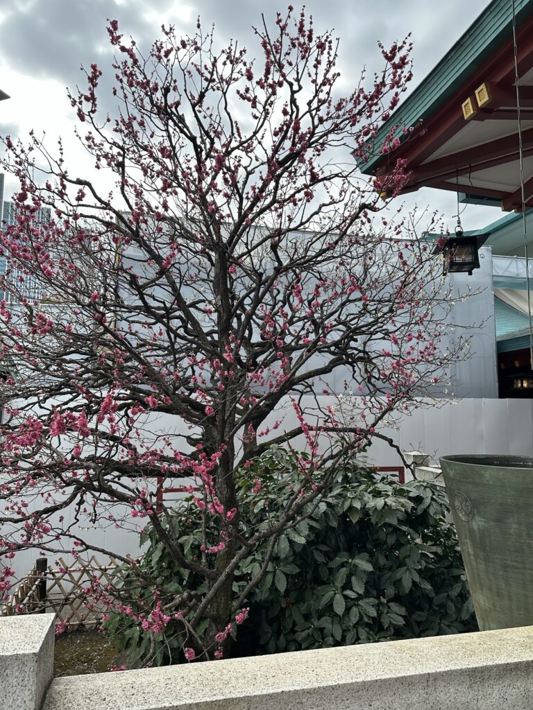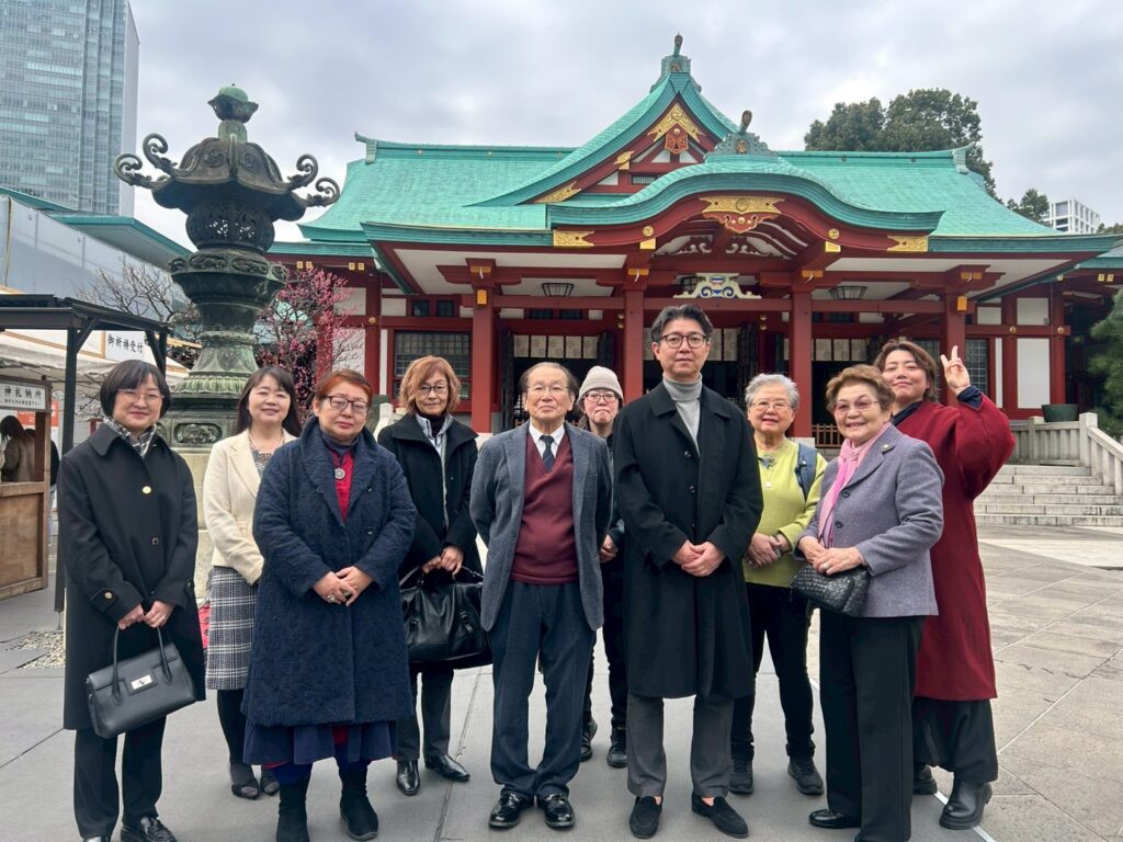 本殿の脇には凛と咲く白梅と紅梅が植えられており、都心にありながら一足早い春の気配を運んでくれました。美しく咲き誇る梅の花を背景に全員で集合写真を撮影し、皆様の晴れやかな笑顔が印象的な素晴らしい思い出となりました。