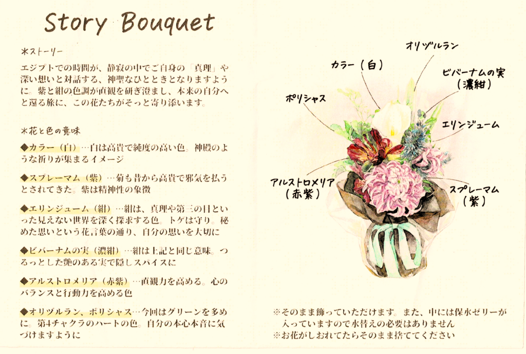 今回のブーケには、3月に控えている私の「エジプト・リトリート」への想いを込めていただきました。