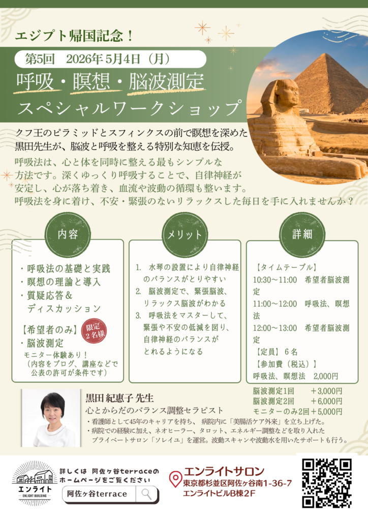 クフ王のピラミッドとスフィンクスで瞑想を深めた黒田先生による、脳波と呼吸を整える特別な時間。マアトの秤のように、心を羽のように軽くする実践編です。